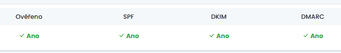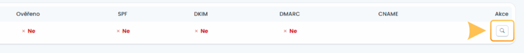Jedná se o následující tři záznamy: SPF, DKIM a DMARC. Údaje, které je potřeba vyplnit, naleznete pod ikonou lupy v části Nastavení → Odesílací domény.