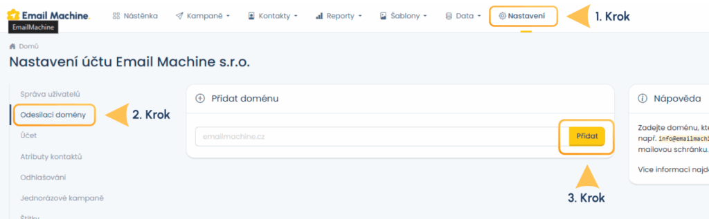 Nejprve si vybavte, u kterého webového registrátora, máte zaregistrovanou doménu, ze které chcete odesílat. Právě tam v administraci nastavíte nové textové záznamy pro Email Machine.