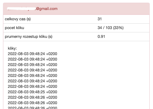 V tomto příkladu můžeme vidět hned 7 prokliků různých odkazů v jedné vteřině. A můžeme tak celkem s jistotou říci, že se jedná o aktivitu bota. Tím pádem nebudeme jeho prokliky počítat do statistik, ani zobrazovat v seznamech prokliků.